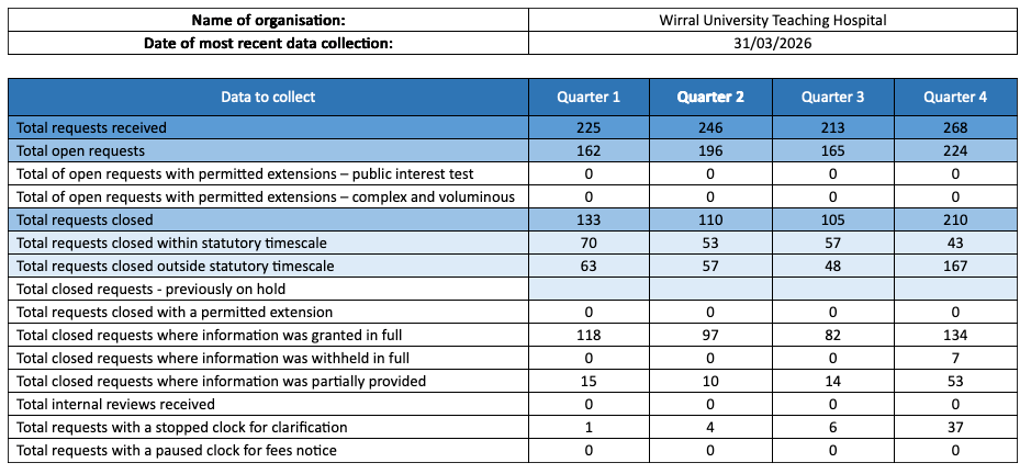 Wirral University Teaching Hospital NHS Foundation Trust (WUTH) is dedicated to fulfilling the statutory requirements under the Freedom of Information Act (FOIA) and Environmental Information Regulations (EIR). We strive to make as much information as possible freely available upon request.
