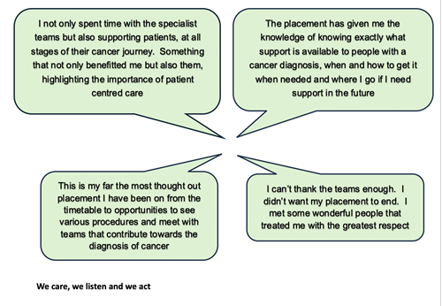 We are constantly striving to improve the experience for our students’ nurses and ask them to complete an evaluation form. Following this, we send evaluation letters back to our teams and celebrate what we do well whilst looking at ways to improve to give student nurses the best experience whilst with us.