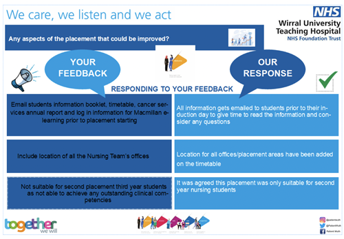 We are constantly striving to improve the experience for our students’ nurses and ask them to complete an evaluation form. Following this, we send evaluation letters back to our teams and celebrate what we do well whilst looking at ways to improve to give student nurses the best experience whilst with us.